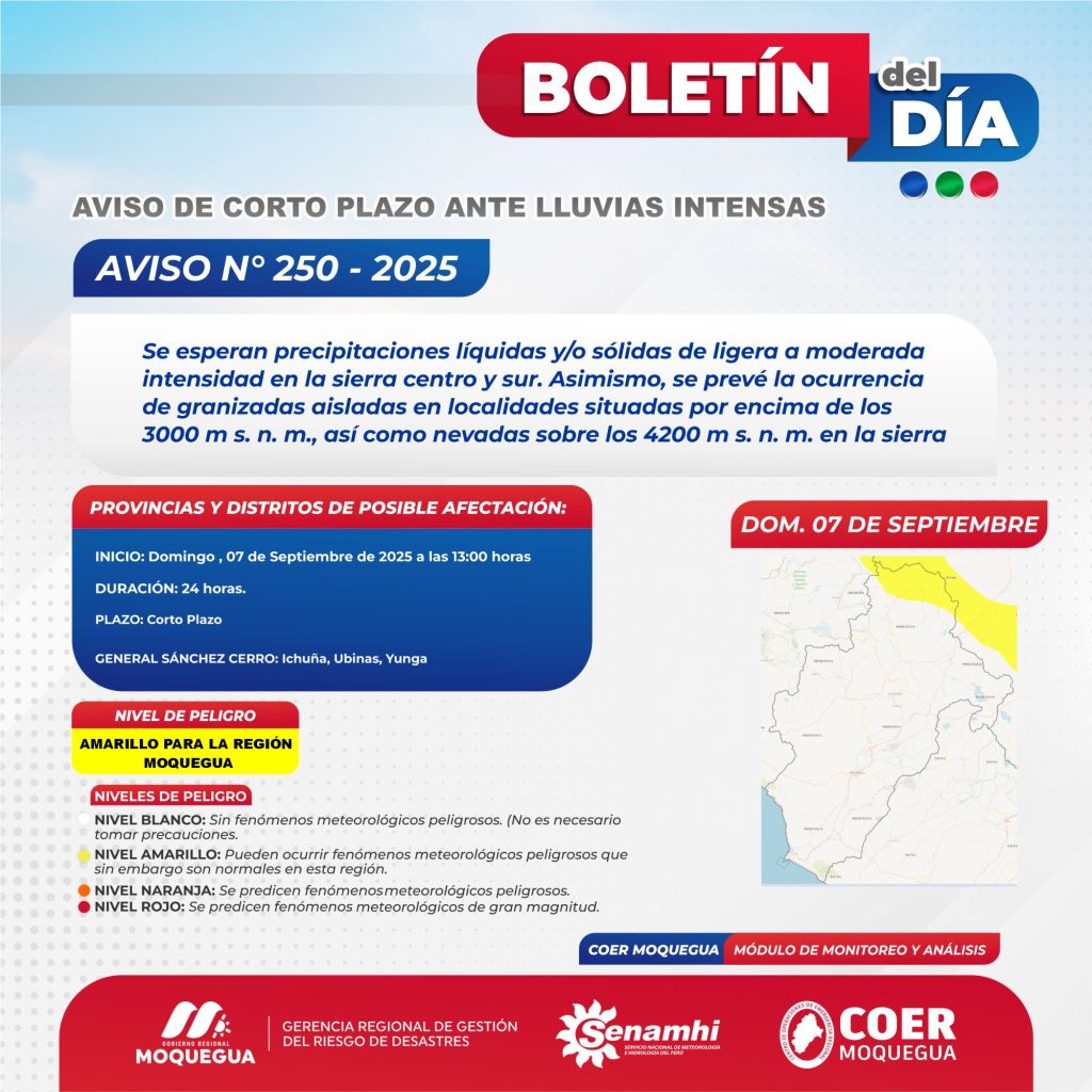 AVISO DE CORTO PLAZO ANTE LLUVIAS INTENSAS N° 250 PARA EL 07 DE SEPTIEMBRE 2025.