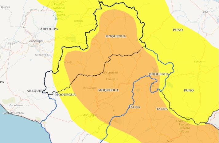 El aviso meteorológico estima un nivel de peligro de color naranja en localidades de los distritos de Ubinas, Ichuña, Yunga, Lloque, Chojata, Matalaque, Omate, Coalaque, Quinistaquillas, Puquina y La Capilla de la provincia General Sánchez Cerro; y las localidades de los distritos de San Cristóbal, Carumas, Cuchumbaya, Torata, Samegua y Moquegua de la provincia Mariscal Nieto.