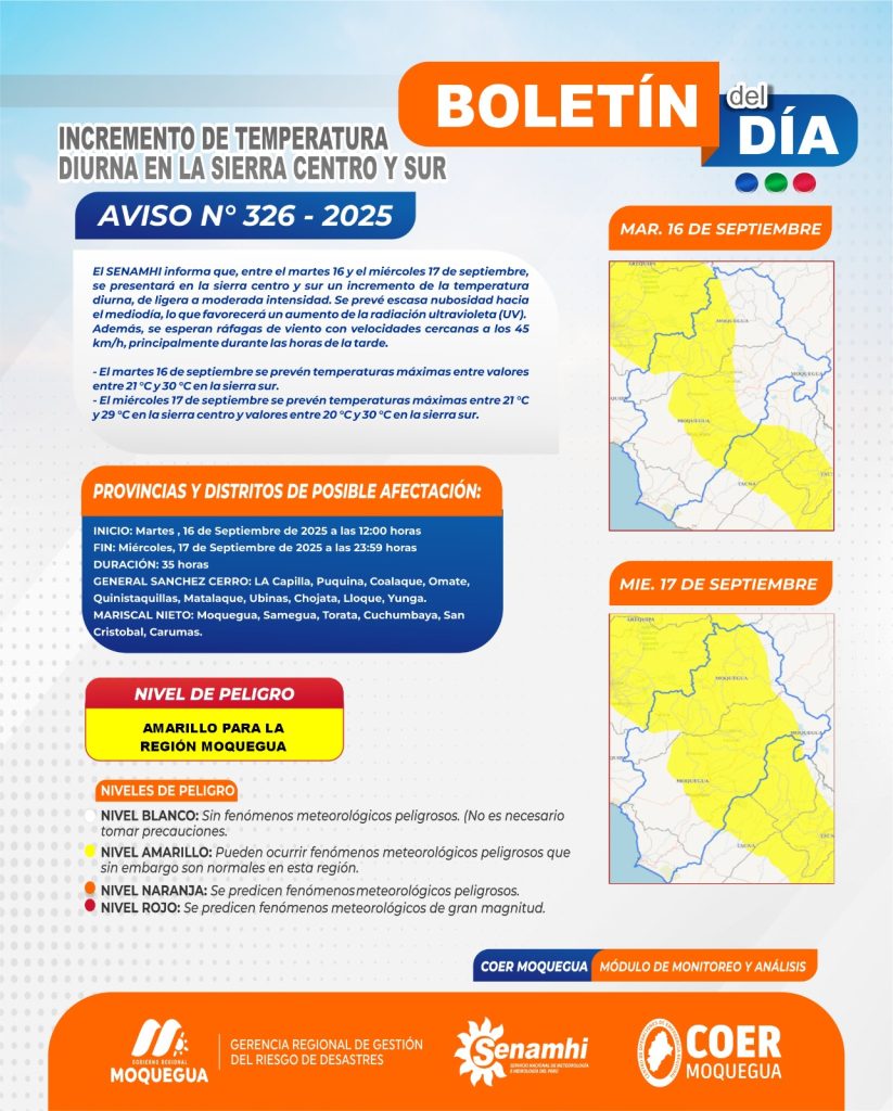 AVISO N° 326 IINCREMENTO DE TEMPERATURA DIURNA EN LA SIERRA CENTRO Y SUR - DESDE EL 16 HASTA EL 17 DE SEPTIEMBRE 2025.