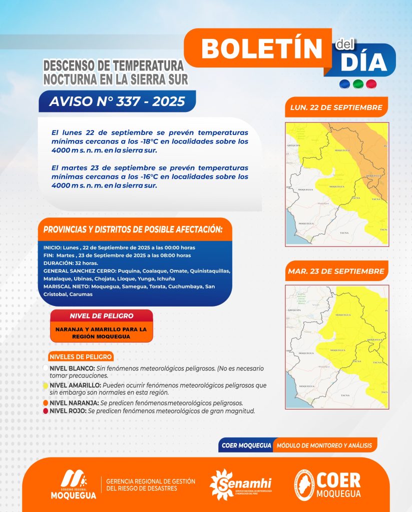 AVISO N° 337 DESCENSO DE TEMPERATURA NOCTURNA EN LA SIERRA SUR – DESDE EL 22 HASTA EL 23 DE SEPTIEMBRE 2025