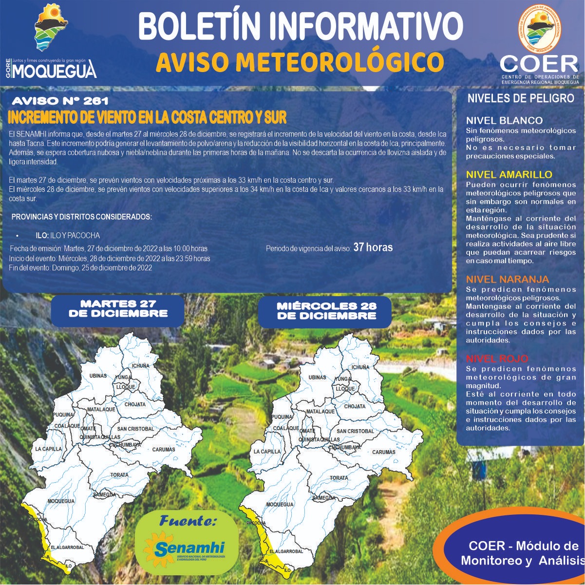 #CoerMoquegua | El Servicio Nacional de Meteorología e Hidrología del Perú (Senamhi), informa que desde el martes 27 al miércoles 28 de diciembre, los distritos de la costa de la región: Ilo, Pacocha y El Algarrobal, registrarán el incremento de la velocidad del viento, que alcanzarán valores por encima de los 33 km/h.