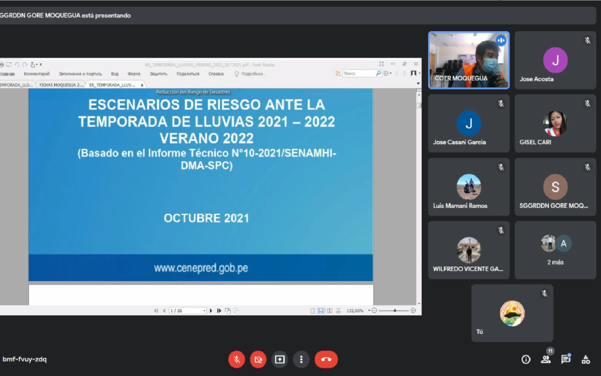 #CoerMoquegua| Con base en el pronóstico trimestral elaborado por el Centro Nacional de Estimación, Prevención y Reducción del Riesgo de Desastres (CENEPRED), el día miércoles 10 de noviembre, desde las 9:00 de la mañana, se ejecutó la jornada virtual de difusión de los “Escenarios de Riesgo Ante la Temporada de Lluvias 2021 – 2022, Periodo Enero – Marzo 2022”, con la participación de autoridades y encargados de las oficinas de Gestión del Riesgo de Desastres de las Municipalidades Provinciales y Distritales de la región Moquegua.