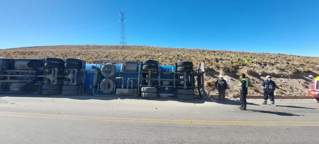La mañana de hoy sábado 08 de julio, al promediar las 7:45 horas, se produjo la volcadura de un camión cisterna en el sector de Chilligua, Km. 83+690 de la Carretera Binacional. El vehículo que transportaba 8,800 galones de petróleo, sufrió el vuelco, pero gracias a las medidas de seguridad implementadas, se controlaron las válvulas y el derrame se limitó a unos pocos litros que fueron contenidos en recipientes adecuados mientras se esperaba la llegada de otro camión cisterna proveniente de Desaguadero para el trasvase de combustible.