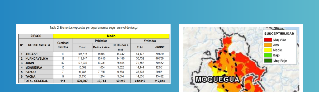Según el “Escenario de Riesgo ante el Descenso de Temperatura Nocturna en la Sierra” publicado el 19 de junio por el CENEPRED, existen diez (10) distritos en la región de Moquegua que son más vulnerables a las bajas temperaturas. En total, estas zonas tienen una población de 18,589 personas, incluyendo 1,004 menores de 5 años y 3,882 adultos mayores de 60 años. Además, hay un total de 14,444 viviendas expuestas, de las cuales 12,951 están ocupadas por sus propietarios, según la información proporcionada por el Instituto Nacional de Estadística e Informática – INEI.