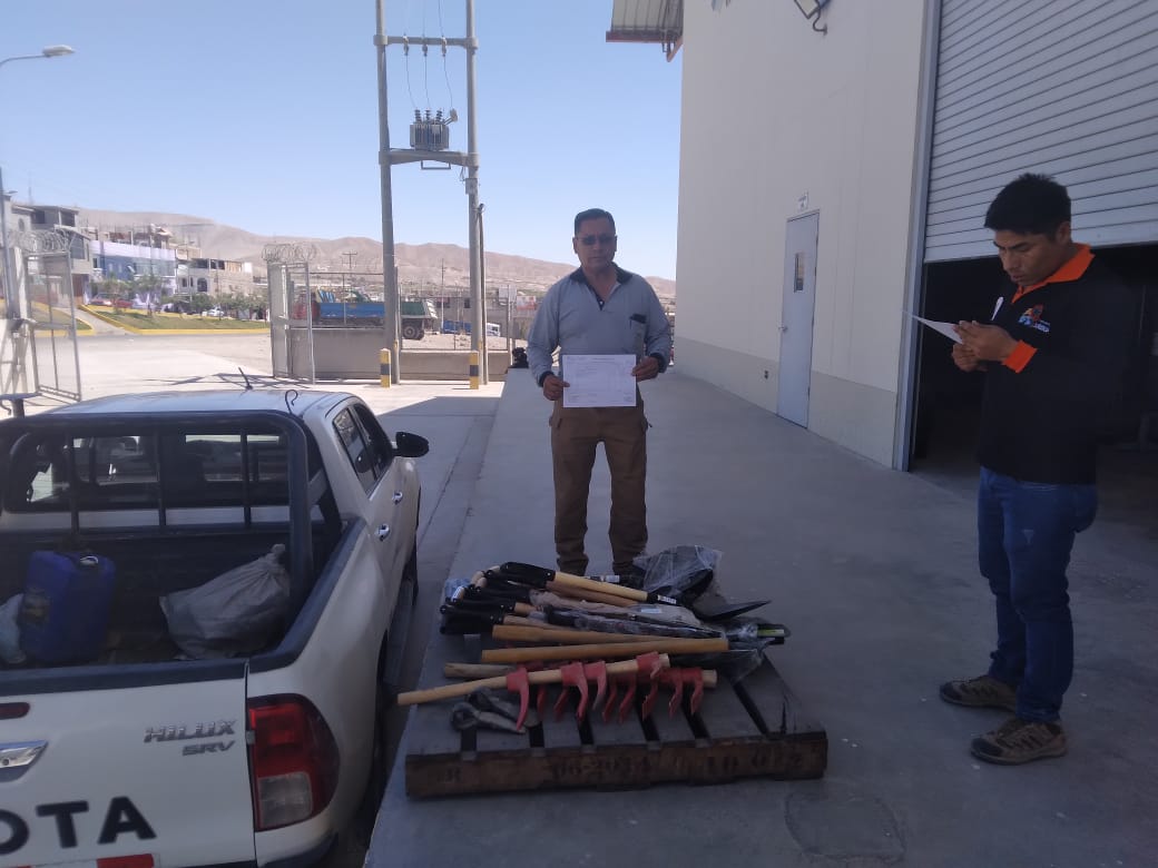 El material recepcionado estuvo compuesto por 8 picos con mango de madera, 4 picos de picadera con mango de madera, 6 palas tipo cuchara con mango de madera, 6 palas tipo recta de metal con mango de madera, 6 machetes, 2 hachas con mango de madera,4 barretas de punta, 6 machetes con gancho.