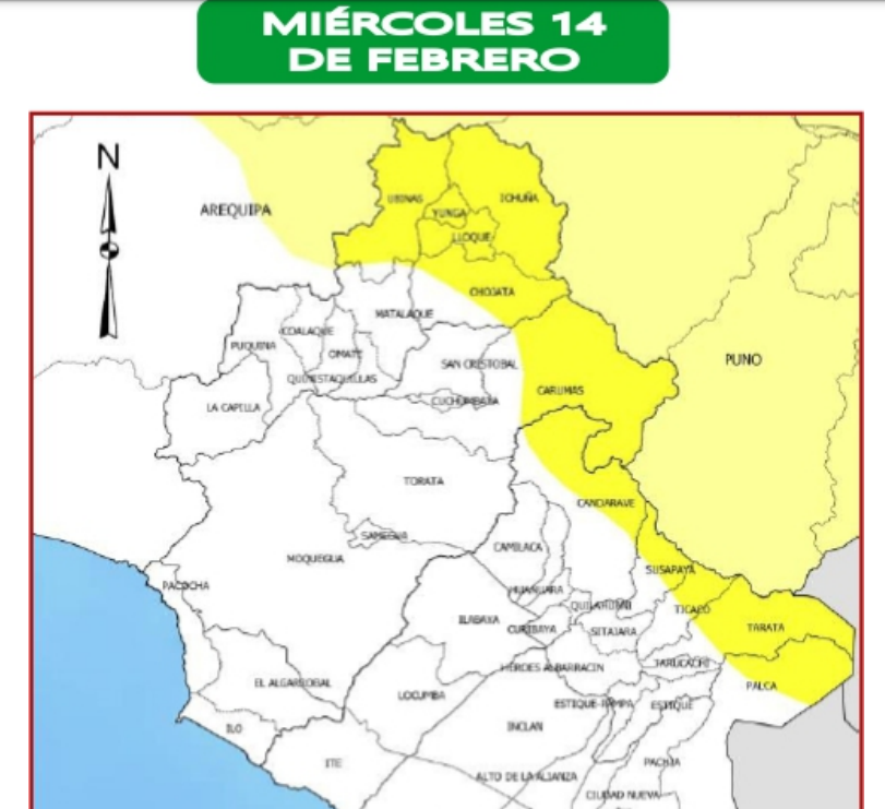 Moquegua es Amarillo. Las provincias de posible afectación son Mariscal Nieto