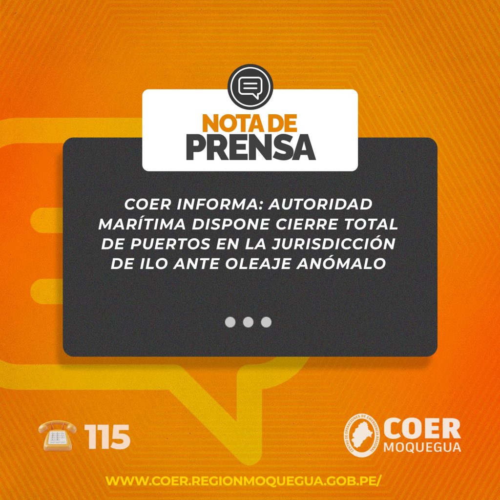 El Centro de Operaciones de Emergencia Regional (COER) Moquegua informa a la población y a las entidades de primera respuesta que, conforme a lo dispuesto por la Capitanía de Puerto de Ilo, se ha ordenado el CIERRE TOTAL de actividades marítimas y portuarias en distintos puntos de la jurisdicción debido a condiciones océano-meteorológicas desfavorables originadas por oleajes anómalos, conforme al Aviso Especial N.º 31-25 y Aviso de Capitanía N.º 054-25.