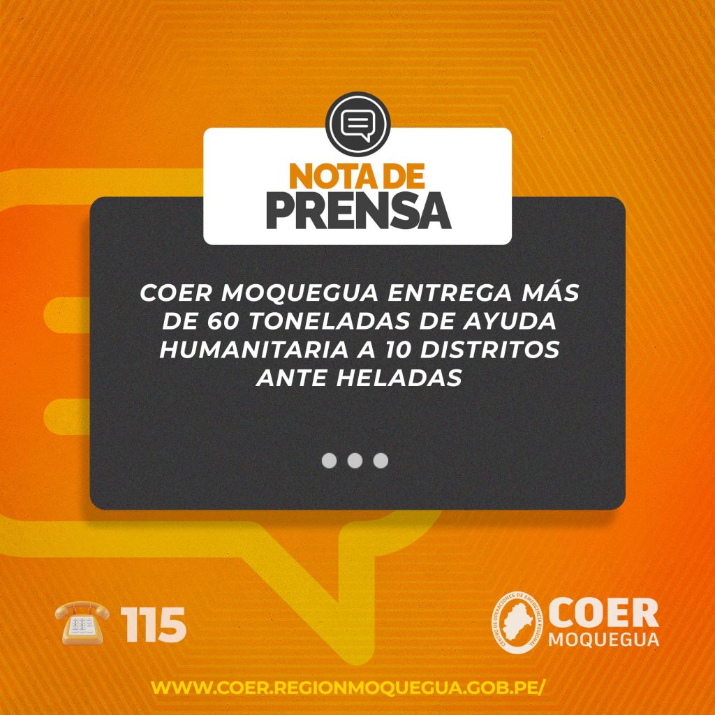 Con el objetivo de mitigar los efectos de las heladas y las bajas temperaturas que afectan a diversas zonas altoandinas de la región, el Gobierno Regional Moquegua, a través de la Gerencia Regional de Gestión de Riesgos y Desastres, concretó la entrega de más de 60 toneladas de ayuda humanitaria en favor de 10 distritos de las provincias de Mariscal Nieto y General Sánchez Cerro.