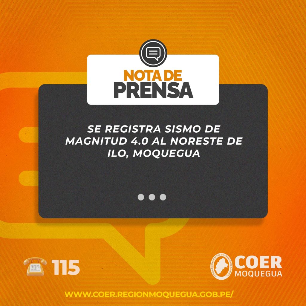 El Centro de Operaciones de Emergencia Regional (COER) Moquegua informa que hoy a las 05:07:34 horas se registró un sismo de magnitud 4.0, con una profundidad de 58 kilómetros, cuyo epicentro se ubicó a 24 kilómetros al noreste de la ciudad de Ilo, provincia de Ilo, región Moquegua. Las coordenadas geográficas del evento fueron latitud -17.47 y longitud -71.2.
