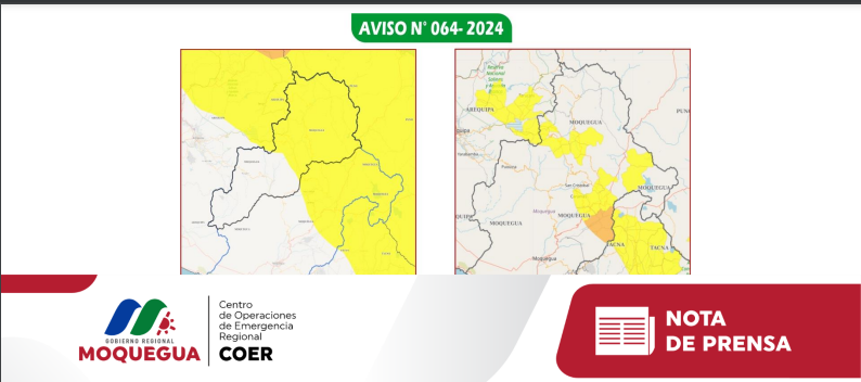 El Centro de Operaciones de Emergencia Regional (COER) Moquegua informa que de acuerdo al aviso meteorológico N° 064 2024 de corto plazo emitido por el Servicio Nacional de Meteorología e Hidrología (SENAMHI), se advierte para este lunes 04 de marzo, la probabilidad de lluvias intensas y activación de quebradas en la región Moquegua en las próximas 24 horas El boletín indica que para el caso de lluvias intensas el nivel de peligro para Moquegua es amarillo, siendo los distritos afectados en Mariscal Nieto: Torata, Carumas, Cuchumbaya y San Cristobal – Calacoa. De igual forma en la provincia General Sánchez Cerro: Chojata, Coalaque, Ichuña, Lloque, Matalaque, Ubinas y Yunga.