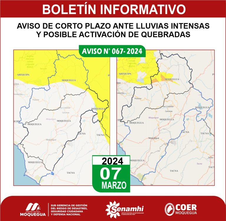 El Centro de Operaciones de Emergencia Regional (COER) Moquegua informa que de acuerdo al aviso meteorológico N° 067-2024 de corto plazo emitido por el Servicio Nacional de Meteorología e Hidrología (SENAMHI), se advierte para este jueves 07 de marzo, la probabilidad de lluvias intensas y activación de quebradas en la región Moquegua en las próximas 24 horas El boletín indica que para el caso de lluvias intensas el nivel de peligro para Moquegua es amarillo, siendo el distrito afectado en Mariscal Nieto: Carumas. De igual forma en la provincia General Sánchez Cerro: Chojata, Ichuña, Lloque, Matalaque, Ubinas y Yunga. Para el caso de la posible activación de quebradas el nivel de peligro para Moquegua es amarillo y naranja. Esto asociado a las lluvias pronosticadas para las siguientes 24 horas, el mismo que se inició desde las 13:00 horas. Los distritos afectados serían en la provincia General Sánchez Cerro: Chojata, Lloque, Matalaque, Ubinas y Yunga. Ante esta situación, el COER Moquegua recomienda a la población tomar las siguientes precauciones: