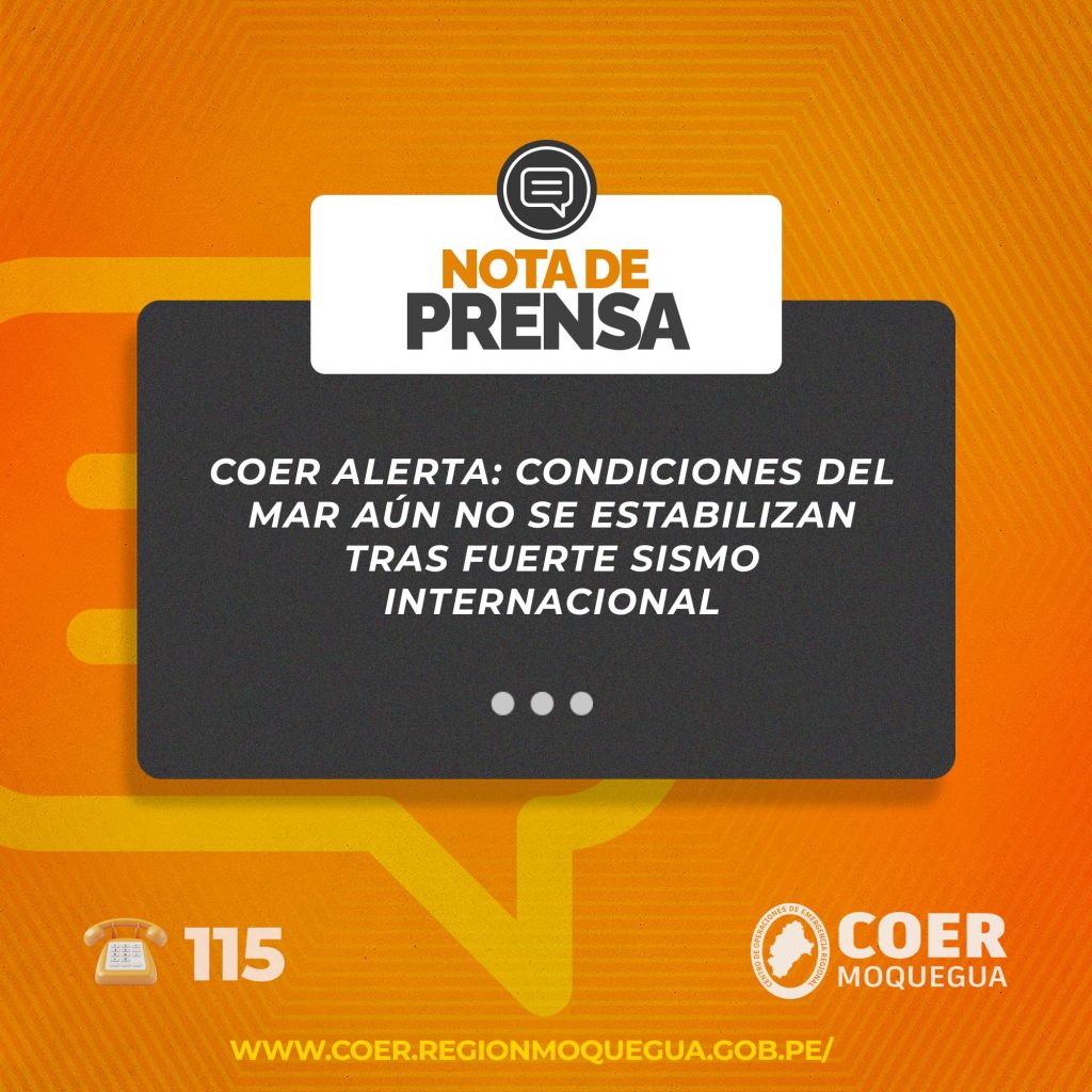 El Centro de Operaciones de Emergencia Regional (COER) Moquegua informa que, producto del monitoreo constante de las condiciones marítimas, se ha registrado un ligero retiro del mar de aproximadamente 10 metros, lo cual indica que aún se mantienen ciertas anomalías oceánicas asociadas al reciente sismo.