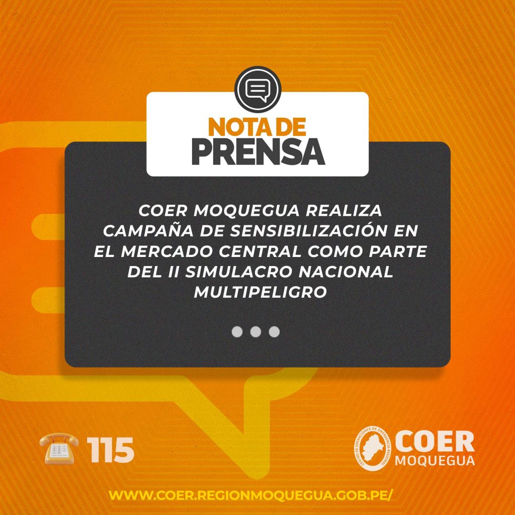 En el marco de las actividades programadas por el II Simulacro Nacional Multipeligro, el Centro de Operaciones de Emergencia Regional (COER) Moquegua, llevó a cabo una importante campaña de sensibilización en la zona focal del Mercado Central, como parte del Programa de Capacitación en preparación y respuesta ante emergencias.