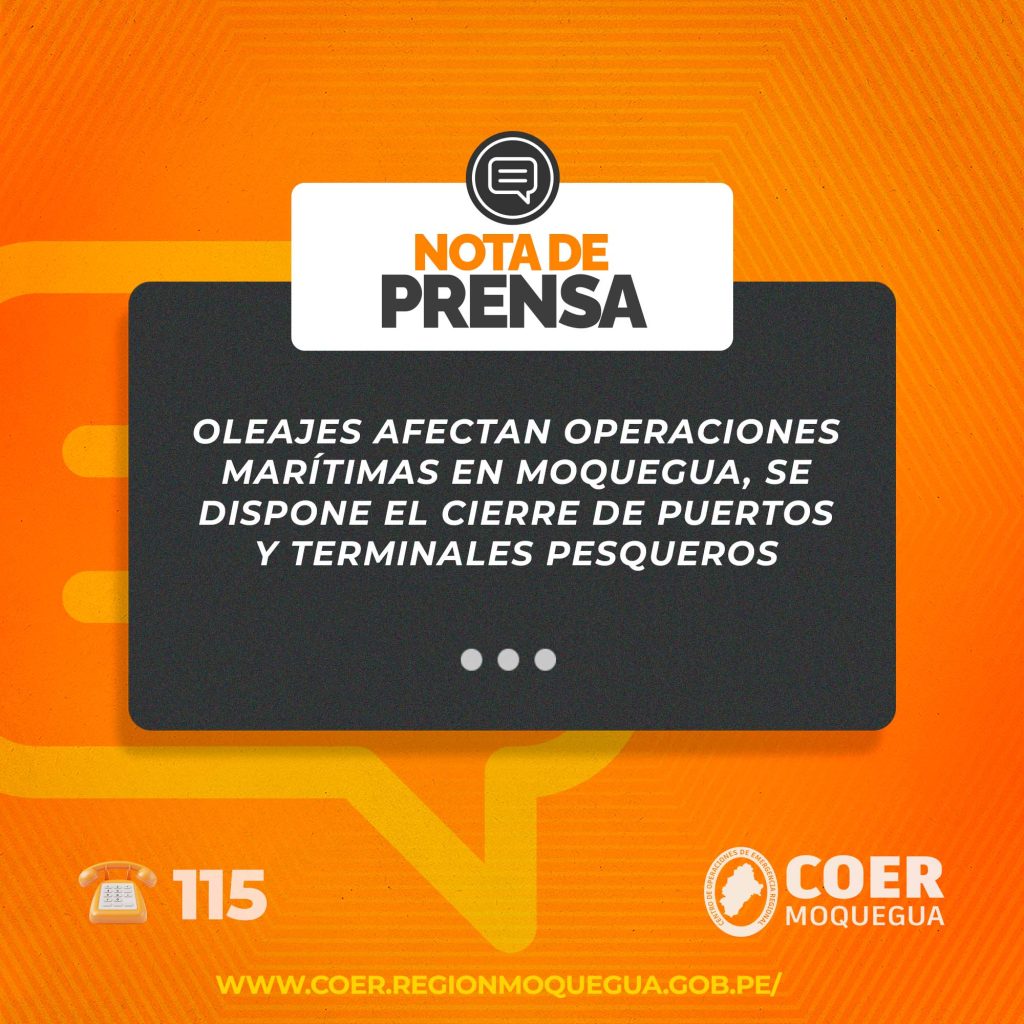 Ante el incremento del riesgo en el litoral por oleajes anómalos, la Capitanía de Puerto de Ilo, en coordinación con el Centro de Operaciones de Emergencia Regional (COER) Moquegua, dispuso el cierre temporal de varios puntos estratégicos del litoral regional, con el fin de salvaguardar la vida humana y prevenir daños al medio acuático.