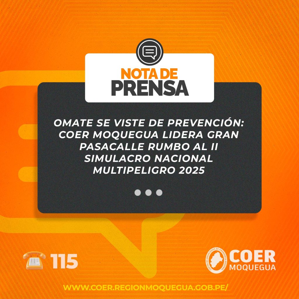 En el marco de las acciones preventivas y de preparación ante emergencias, el Centro de Operaciones de Emergencia Regional (COER) Moquegua, en articulación con las entidades de primera respuesta, llevó a cabo el día martes 12 de agosto del presente año, un colorido pasacalle de sensibilización por las principales calles del distrito de Omate, provincia General Sánchez Cerro, con motivo del II Simulacro Nacional Multipeligro 2025.