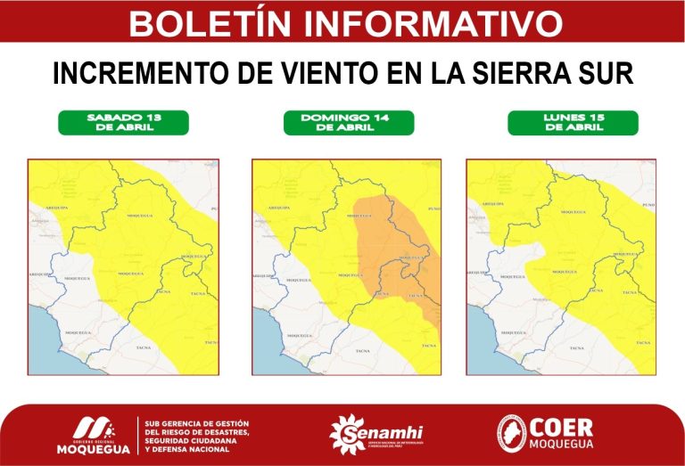 El Centro de Operaciones de Emergencia Regional (COER) Moquegua informa que de acuerdo al aviso meteorológico N° 092-2024 emitido por el Servicio Nacional de Meteorología e Hidrología (SENAMHI), se advierte que a partir del sábado 13 hasta al lunes 15 de abril, se registrará el incremento de la velocidad del viento en la sierra sur peruana.