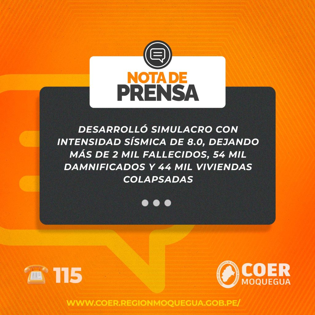 El simulacro, que también contempló un escenario de tsunami en Ilo y actividad volcánica en la provincia de General Sánchez Cerro, se ejecutó con una magnitud sísmica de 8.0 grados. Según la evaluación de daños, dejó como saldo en las tres provincias: 2,870 personas fallecidas, 54,371 damnificados, 44,107 viviendas destruidas, 51 instituciones educativas colapsadas, casi 4 kilómetros de vías destruidas y 19 centros de salud inoperativos, entre otros daños registrados.