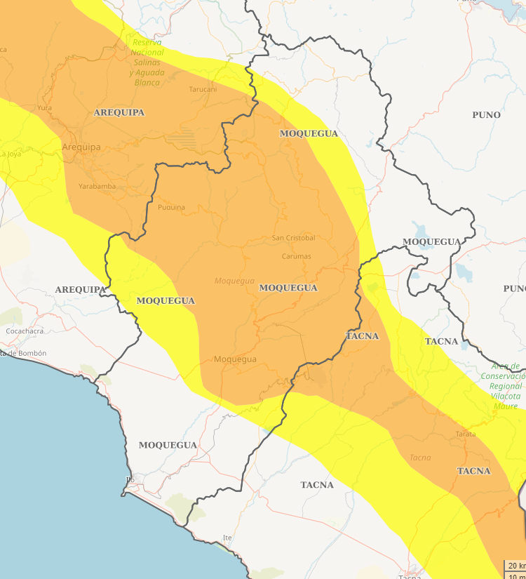 El Aviso Meteorológico considera en el nivel NARANJA localidades de los distritos de Amazonas, Ancash, Apurímac, Arequipa, Ayacucho, Cajamarca, Cusco, Huancavelica, Huánuco, Ica, Junín, La Libertad, Lima, Moquegua, Pasco, Puno, San Martin y Tacna.