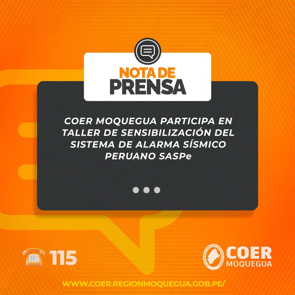 Con el objetivo de reforzar la preparación de autoridades, funcionarios y población frente a posibles emergencias, el Centro de Operaciones de Emergencia Regional (COER) Moquegua participó en el Taller de Sensibilización del Sistema de Alarma Sísmico Peruano (SASPe), organizado por la Dirección Desconcentrada del Instituto Nacional de Defensa Civil (INDECI) Moquegua.