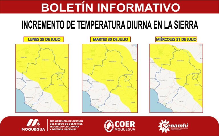 El Centro de Operaciones de Emergencia Regional (COER) Moquegua informa que de acuerdo al aviso meteorológico N° 187-2024 emitido por el Servicio Nacional de Meteorología e Hidrología (SENAMHI), se advierte que entre el lunes 29 y miércoles 31 de julio, continuará el incremento de la temperatura diurna en la sierra sur, de moderada a fuerte intensidad, la cual incluye al departamento de Moquegua.