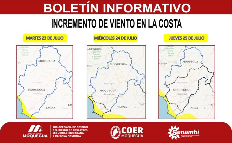 El Centro de Operaciones de Emergencia Regional (COER) Moquegua informa que de acuerdo al aviso meteorológico N° 181-2024 emitido por el Servicio Nacional de Meteorología e Hidrología (SENAMHI), se advierte que a partir del martes 23 al jueves 25 de julio, se registrará el incremento de la velocidad del viento, de moderada a fuerte intensidad en la costa. Según el boletín, este incremento podría generar el levantamiento de polvo/arena y la reducción de la visibilidad horizontal, principalmente en Ica. Además, se espera cobertura nubosa con niebla/neblina y llovizna dispersa hacia el atardecer, madrugada y las primeras horas de la mañana. El nivel de peligro para Moquegua es amarillo, iniciándose el evento el martes 23 de julio a las 00:00 horas y concluirá el jueves 25 de julio a las 23:59 horas, con una duración de 71 horas. En la provincia de Mariscal Nieto el distrito afectado será Moquegua y en la provincia de Ilo: Ilo, Pacocha y El Algarrobal. El martes 23 de julio, se prevén vientos con velocidades superiores a los 32 km/h en la costa norte, cercana a los 34 km/h en la costa central, próximos a los 20 km/h en la costa sur y por encima a los 40 km/h en la costa de Ica. El miércoles 24 de julio, se prevén vientos con velocidades por encima de los 32 km/h en la costa norte, cercana a los 34 km/h en la costa centro con valores próximos a los 20 km/h en la costa sur y por encima a los 40 km/h en la costa de Ica. El jueves 25 de julio, se prevén vientos con valores superiores a los 32 km/h en la costa norte, cercana a los 34 km/h en la costa central, velocidades próximas a los 20 km/h en la costa sur y por encima a los 40 km/h en la costa de Ica. El COER Moquegua continuará con el monitoreo de los posibles impactos de este fenómeno meteorológico, coordinando y articulando acciones necesarias para garantizar una atención eficaz ante cualquier emergencia.