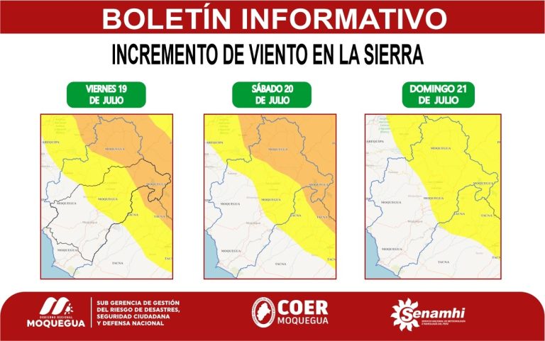 El Centro de Operaciones de Emergencia Regional (COER) Moquegua informa que de acuerdo al aviso meteorológico N° 176-2024 emitido por el Servicio Nacional de Meteorología e Hidrología (SENAMHI), se advierte que entre el viernes 19 al domingo 21 de julio, se registrará el incremento de la velocidad del viento, de moderada a fuerte intensidad en la sierra.