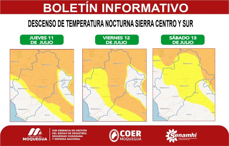 El Centro de Operaciones de Emergencia Regional (COER) Moquegua informa que de acuerdo al aviso meteorológico N° 160-2024 emitido por el Servicio Nacional de Meteorología e Hidrología (SENAMHI), se advierte que desde el jueves 11 al sábado 13 de julio, continuará registrándose el descenso de la temperatura nocturna de moderada a fuerte intensidad en la sierra centro y sur del país, incluida la región Moquegua.