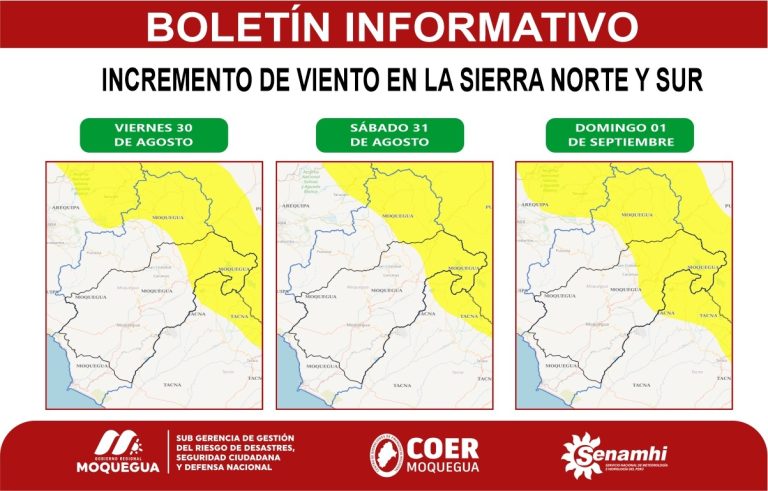 El Centro de Operaciones de Emergencia Regional (COER) Moquegua informa que de acuerdo al aviso meteorológico N° 239-2024 emitido por el Servicio Nacional de Meteorología e Hidrología (SENAMHI), se advierte que entre el sábado 31 de agosto y domingo 01 de septiembre, se registrarán precipitaciones (nieve, granizo, aguanieve y lluvia) de moderada a fuerte intensidad en la sierra centro y sur del país, la cual incluye al departamento de Moquegua.
