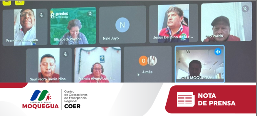 El Centro de Operaciones de Emergencia Regional (COER) Moquegua informa que la mañana de este miércoles 27 de diciembre se cumplió con la reunión virtual de coordinación para implementar un Sistema de Alerta Temprana (SAT) Comunitaria por activación de quebradas e ingreso de río ante el fenómeno de lluvias intensas, en los distritos de Samegua y Torata.