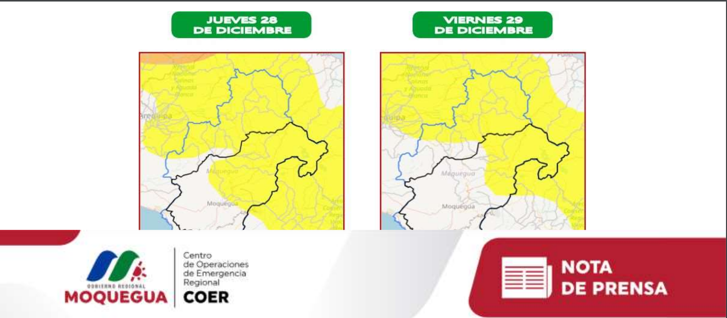 El Centro de Operaciones de Emergencia Regional (COER) Moquegua informa que de acuerdo al aviso meteorológico N° 295 emitido por el Servicio Nacional de Meteorología e Hidrología (SENAMHI), se advierte que desde el jueves 28 al viernes 29 de diciembre, se presentarán precipitaciones (nieve, granizo, aguanieve y lluvia) de moderada a fuerte intensidad en la sierra y de fuerte a extrema intensidad en zonas localizadas de las regiones de Tumbes y Piura.