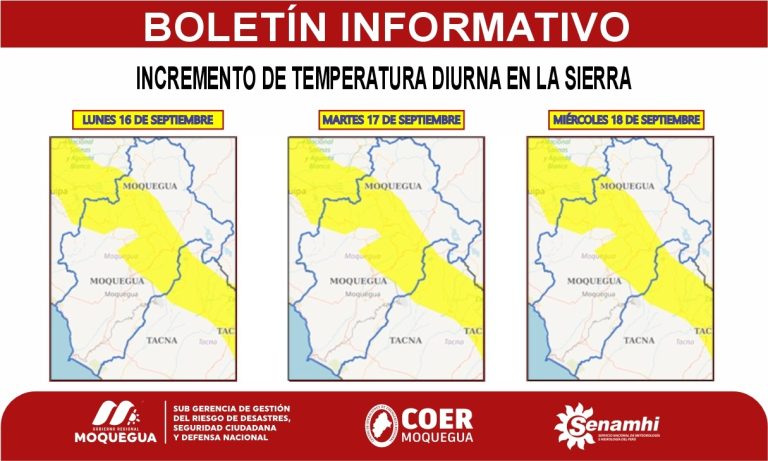 El Centro de Operaciones de Emergencia Regional (COER) Moquegua informa que de acuerdo al aviso meteorológico N° 264-2024 emitido por el Servicio Nacional de Meteorología e Hidrología (SENAMHI), se advierte que entre el lunes 16 y miércoles 18 de septiembre, se presentará el incremento de la temperatura diurna en la sierra sur, de moderada a fuerte intensidad, la cual incluye al departamento de Moquegua.