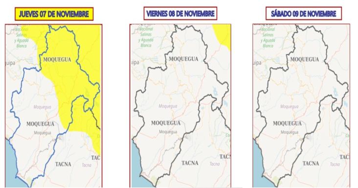 Según el boletín, indica además que se esperan ráfagas de viento con velocidades próximas a los 40 km/h. El nivel de peligro para Moquegua es amarillo.