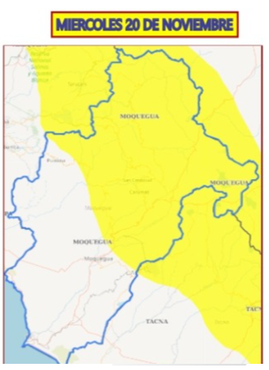 El Centro de Operaciones de Emergencia Regional (COER) Moquegua informa que de acuerdo al aviso meteorológico N° 352-2024 emitido por el Servicio Nacional de Meteorología e Hidrología (SENAMHI), se advierte que el miércoles 20 de noviembre, continuará el incremento de la temperatura diurna, de moderada a fuerte intensidad, en la sierra. Además, se espera el incremento de la radiación ultravioleta (UV), ráfagas de viento con velocidades de 35 Km/h, especialmente por la tarde, descenso de la temperatura nocturna y no se descarta la ocurrencia de precipitaciones.