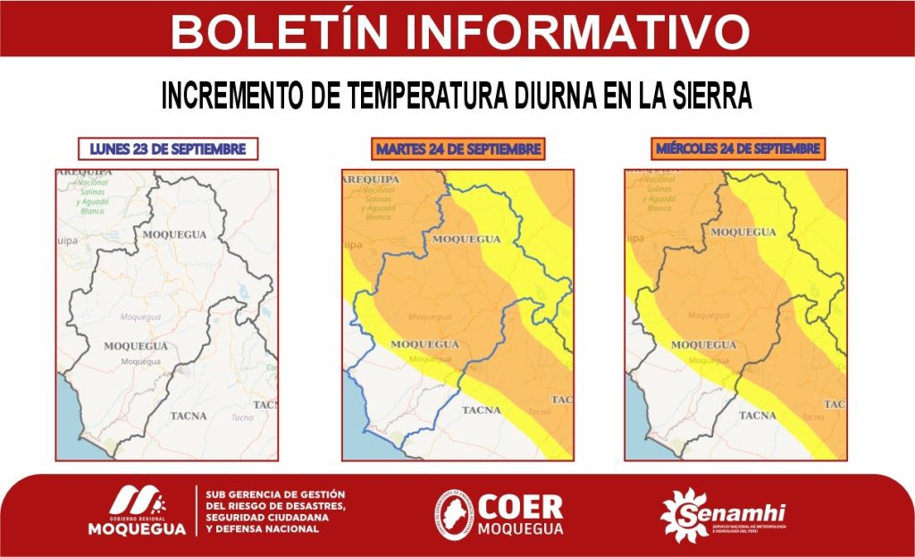 El Centro de Operaciones de Emergencia Regional (COER) Moquegua informa que de acuerdo al aviso meteorológico N° 270-2024 emitido por el Servicio Nacional de Meteorología e Hidrología (SENAMHI), se advierte que entre el lunes 23 y miércoles 25 de septiembre, se presentará el incremento de la temperatura diurna de moderada a fuerte intensidad en la sierra sur, la cual incluye al departamento de Moquegua.