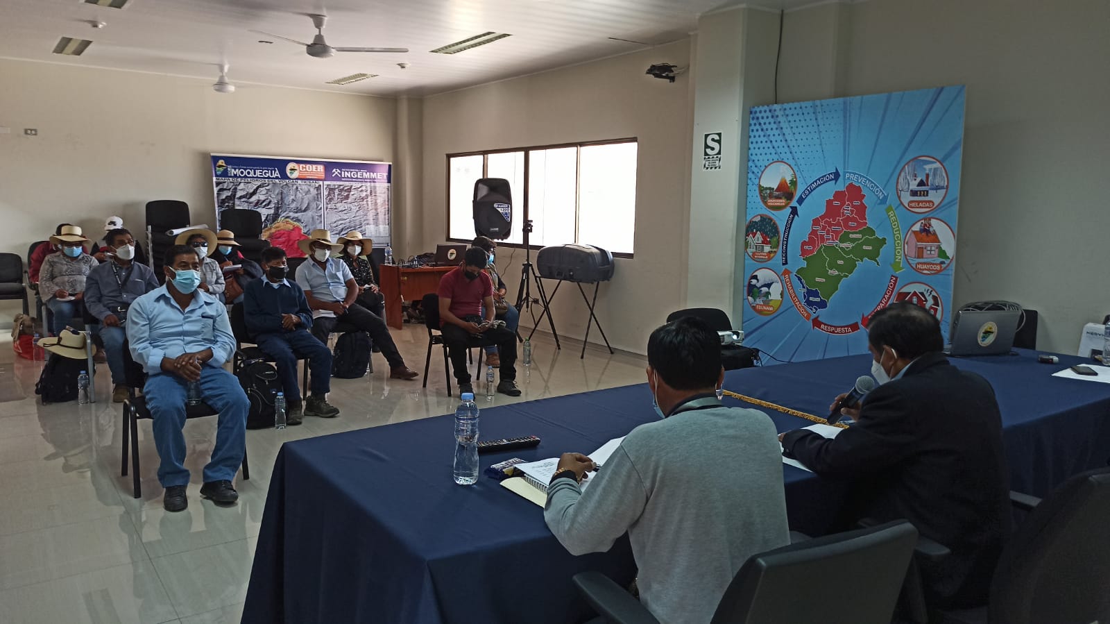 La reunión se llevó a cabo de manera presencial para las autoridades de Moquegua y de manera virtual para autoridades de INGEMMET, IGP, SENAMHI y CENEPRED, en las instalaciones del Centro de Operaciones de Emergencia Regional – COER Moquegua.