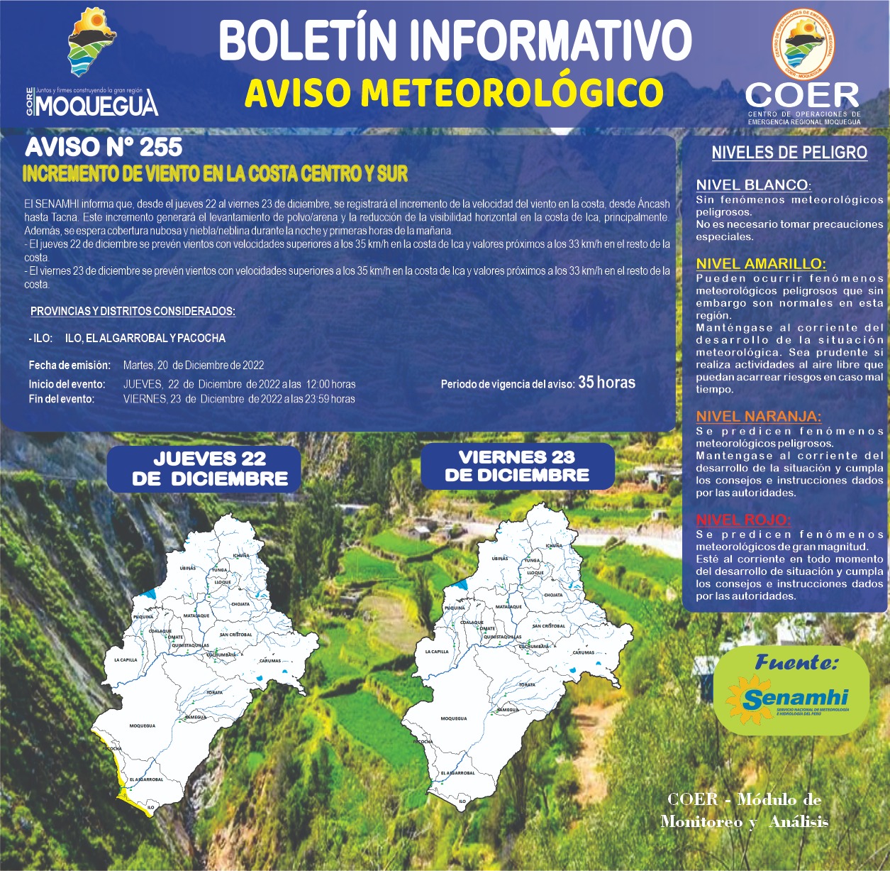 #CoerMoquegua |El Servicio Nacional de Meteorología e Hidrología del Perú (Senamhi), informa que desde el jueves 22 al viernes 23 de diciembre, los distritos de la costa de la región: Ilo, Pacocha y El Algarrobal, registrarán el incremento de la velocidad del viento, que alcanzarán valores por encima de los 33 km/h.