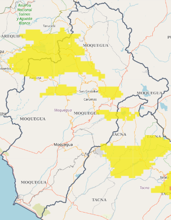 El Centro de Operaciones de Emergencia Regional (COER) Moquegua informa que de acuerdo al aviso meteorológico N° 347 de corto plazo emitido por el Servicio Nacional de Meteorología e Hidrología (SENAMHI), se advierte para este miércoles 13 de diciembre, la probabilidad de lluvias intensas en la región Moquegua en las próximas 24 horas