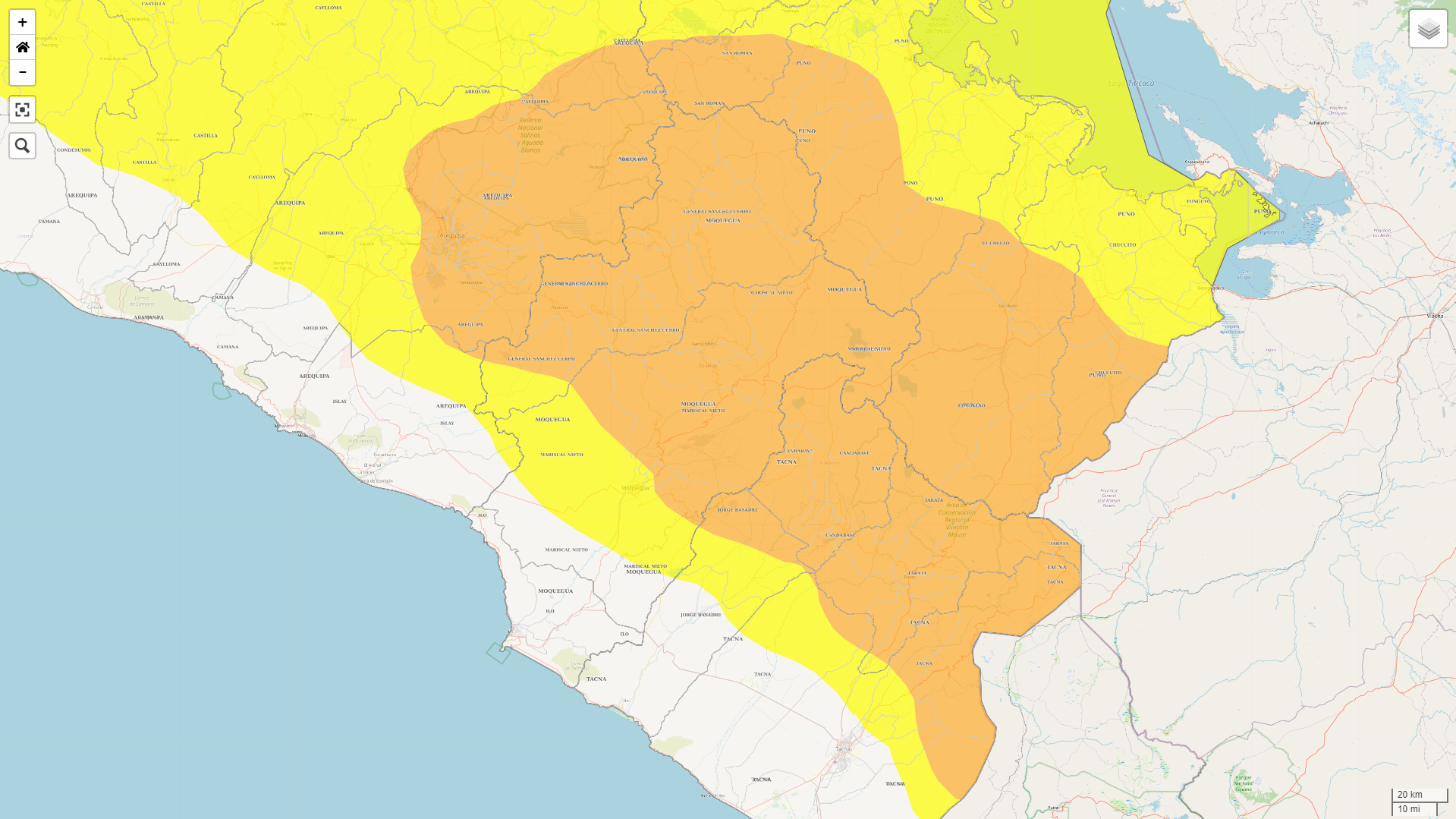 El Aviso Meteorológico estima un nivel de peligro color naranja en la mayoría de localidades de los distritos de Ubinas, Ichuña, Yunga, Lloque, Chojata, Matalaque, Puquina, Coalaque, Quinistaquillas, Omate, San Cristóbal, Cuchumbaya, Carumas, Torata, La Capilla, Samegua y Moquegua.