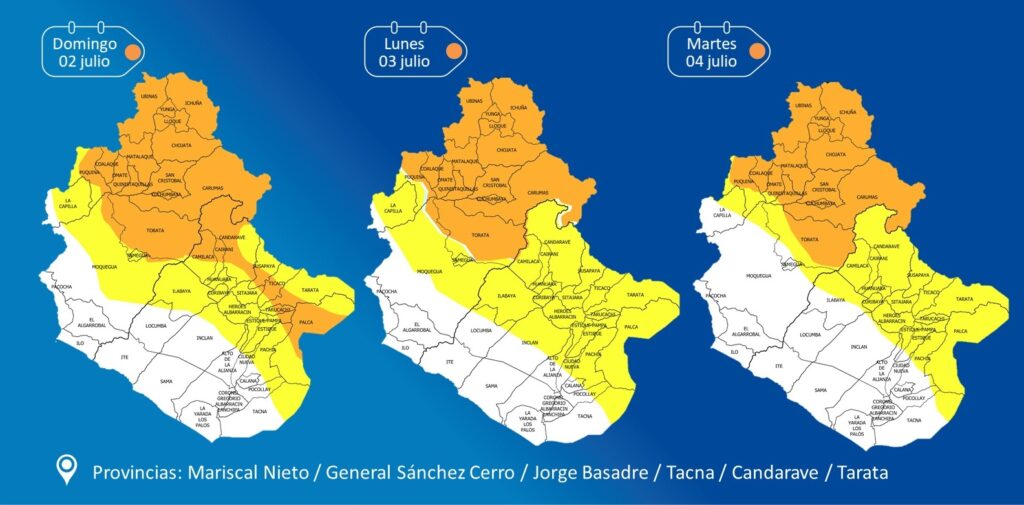 El Servicio Nacional de Meteorología e Hidrología del Perú (SENAMHI) emitió un nuevo Aviso Meteorológico N° 137 de nivel NARANJA, advirtiendo sobre el descenso de la temperatura nocturna en la sierra de Moquegua desde el domingo 02 al martes 04 de julio. En las localidades situadas por encima de los 4 000 m.s.n.m., se esperan temperaturas por debajo de los -20 °C y temperaturas mínimas entre los 0°C y -5°C en localidades sobre los 3000 msnm.