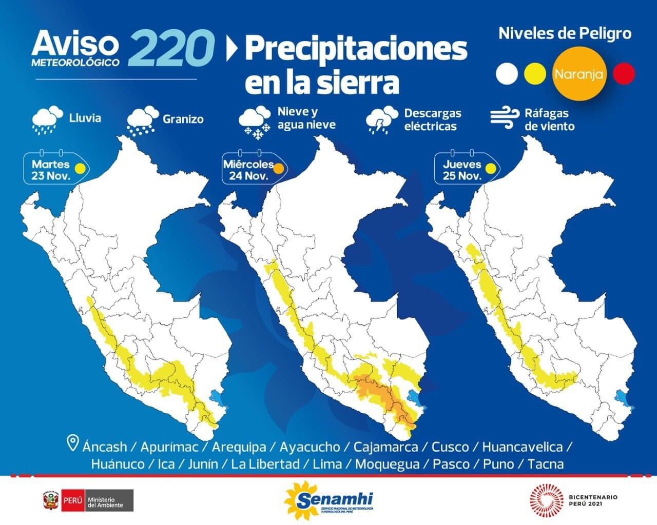 De acuerdo al Aviso Meteorológico N°220, emitido por el organismo, las precipitaciones de nieve alcanzarán acumulados próximos a los 10 centímetros en zonas sobre los 4000 m. s. n. m. Mientras que, en localidades por encima de los 3000 m. s. n. m. se espera la ocurrencia de lluvias y granizo. Siendo el miércoles 24, el día con nivel naranja en que, se pronostica ocurrencias más peligrosas y lluvias que lleguen hasta los 25 milímetros por día.