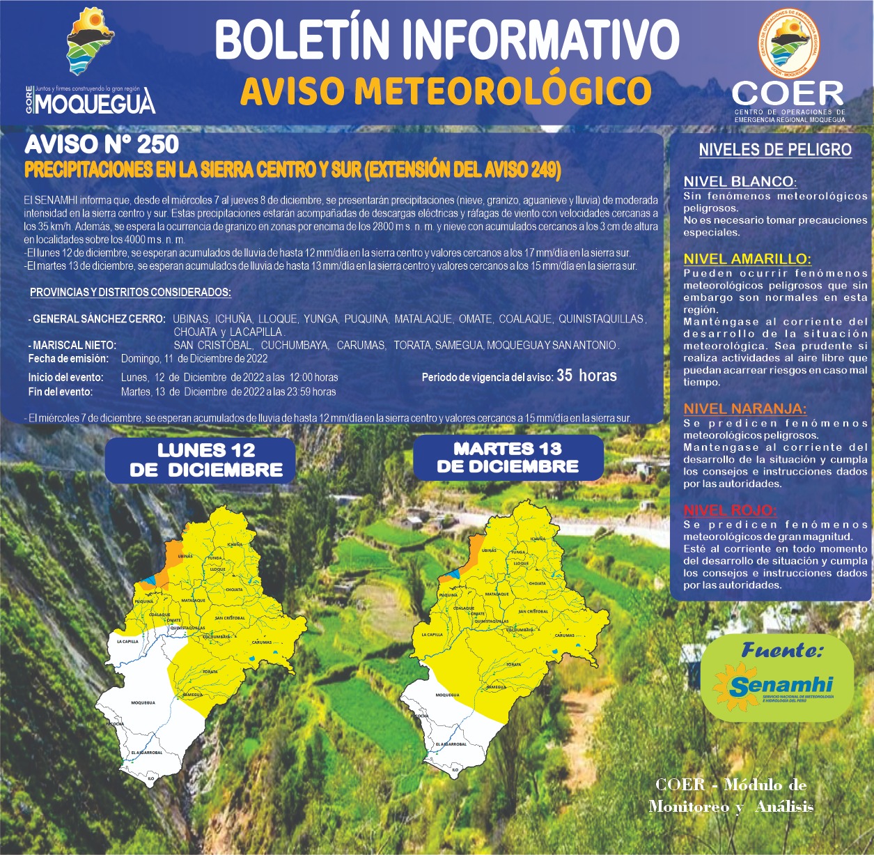 #CoerMoquegua |El Servicio Nacional de Meteorología e Hidrología del Perú (SENAMHI), mediante el Aviso N°250 (extensión del Aviso N°249), informa que entre el lunes 12 y martes 13 de diciembre, se presentarán precipitaciones (nieve, granizo, aguanieve y lluvia) de moderada intensidad en la sierra de nuestra región.
