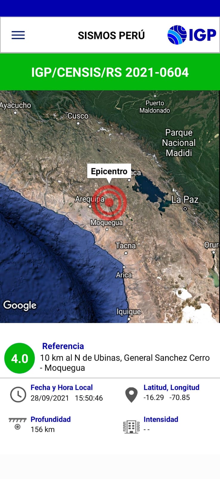 #CoerMoquegua|La tarde de hoy martes 28 de septiembre, se registró un sismo de magnitud 4.0 a 10 km al norte del distrito de Ubinas, en la provincia General Sánchez Cerro. El movimiento fue considerado de