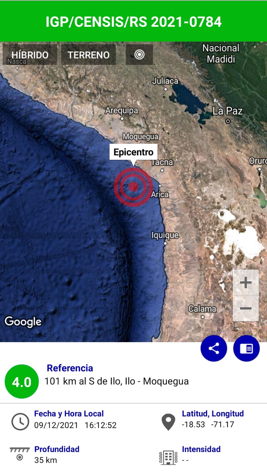 #CoerMoquegua|La tarde de hoy jueves 09 de diciembre, se registró un sismo de magnitud 4.0 a 101 km al sur de distrito de Ilo, en la provincia de Ilo. El movimiento fue considerado de intensidad leve según los parámetros sísmicos registrados por el Instituto Geofísico del Perú (IGP).