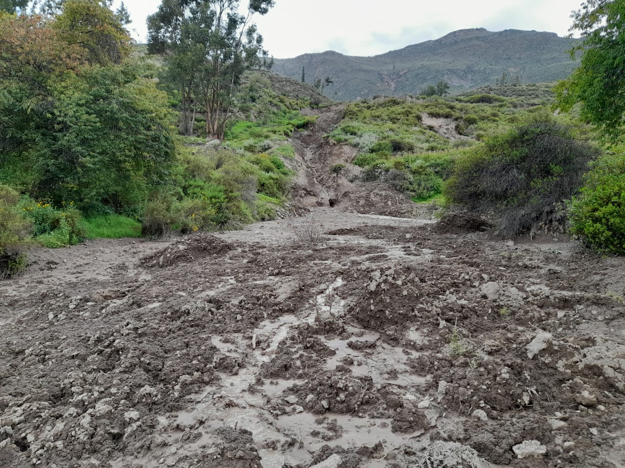 Según el reporte, el evento habría iniciado al promediar las 06:00 de la mañana del domingo 20 de marzo, descubriéndose ojos de aguas que, al combinarse con la tierra circundante, ocasionaron el deslizamiento que cubrió terrenos agrícolas con plantaciones de paltos, manzanas, duraznos.